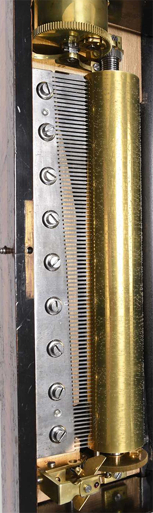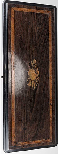 The case cross-banded, the top inlaid with marquetry musical trophies, raised on ebonised bracket feet, the unsigned movement playing eight airs. Numbered 27891 to the winding handle. With case key.