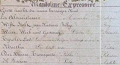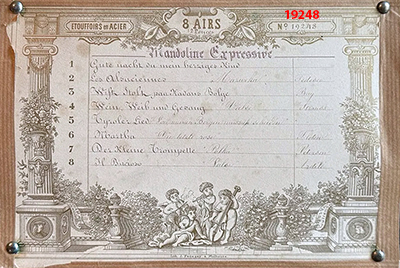 [6] 20231, 1st: Carmen, 5th: Trovatore, [7] 1st: Fille de Mdm. Ang., 2nd: Perichole, N° 2002 Mandolinata Paladhile, 8 airs, N° 2067 Harpe Harmonique Zither, 8 airs, N° 2543 Mandoline Piccolo Zither, 6 airs, N° 2901 Mandoline Expressive, 12 airs, N° 5087: 3rd: Aida, 5th: Home Sweet Home, 10 airs, N° 8123 (?), 1st: Home Sweet Home, N° 10924, (W. Tell, Bar. v. Sevilla), N° 10980, 2nd: Wiener Blut, 6 airs, N° 11457 Mandoline Zither, 6 airs, N° 19248 Mandoline Expressive, N° 52888 Harpe Harmonique, 8 airs Pattern 1, No. 2067 Lith.: Haas, Mulhouse