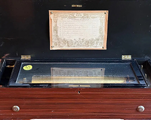 ©OITE A MUSIQUE rectangulaire en bois mouluré, placage de palissandre et acajou, bois noirci et filets de bois clair. Le couvercle orné d'une marqueterie d'un trophée d'instrument de musique dans un motif feuillagé. Deux poignées latérales. Elle ouvre sur un mécanisme en laiton et métal fermé par un couvercle vitré. Avec le programme des 6 airs inscrits à l'encre sur un carton sous le couvercle. Système de remontage par manivelle latérale fixe. Deux loquets de réglage sur le côté droit. (manque des lames , rayures) Haut.: 16 cm - Larg.: 58 cm - Prof.: 22.5 cm 8 septembre 2021 Actéon N° 2901: Mandoline Expressive, 12 airs