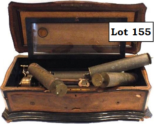 An exhibition-standard serpentine-form interchangeable cylinder musical box by G. Baker-Troll For a brave restoration With large single-spring motor, single-section comb with zither attachment, on reeded cast gilt bedplate, with four cylinders each wrapped individually in newspaper, lacking divider and control board and also governor but block present, under dustlid, in once superbly refined case of exhibition quality, with stained bird’s-eye maple veneered panel to lid interior, base and lid edges with kingwood crossbanding, the serpentine-form case with butterfly burr-walnut veneers, large absent metal plaque to lid centre, plinth base – pine chassis badly eaten in places by Eastern larvae (long dead). Measures: Case 33 inches (84 cm) wide. Cylinders 13 inches (33cm) Footnote: This is a very good example of how pests [Schädlinge] can invade the tasty pine, but leave the bitter veneers. Be careful when handling. I think most of the veneers can be saved – the nice touch here is the crossbanding seen on the edge of both base and lid when the box is opened. This would have had a stand/table for the cylinders as the location peg ends are in-situ. A very careful manual turn, due to there being no governor, reveals a movement well-worth restoring. It sounds extremely good, even in this state. (©Laurence Fisher)