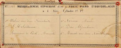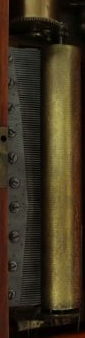 „I feel sure the wedding march is the Mendelssohn item most seen on tune sheets; it goes very well with drum and bells, as noted in fig. 1-15 for L´Epée Serial No. 1216. Suppé´s Boccaccio of 1879 is the latest tune of the six and its amusing that only the composers of the last two get their names on the tune sheet scrolls! The others are famous in different ways including T.B. Bishop of Maine, U.S.A., who wrote the words and the music for When Johnny Comes Marching Home Again. He had previously written, in 1859, first the chorus and later the verses of John Brown´s Body Lies A-mouldering … The strange thing about this tune sheet, which I am sure is the original for this musical box, is the FC monogram at top center, because it is always associated with F. Conchon. He was fully established by 1879 an no link is known between him and L´Epée. Nor can I explain the No. 2863 on the tune sheet, as 748 is probably the Gamme number. The printing is in black and gold by J. Pattegay, Mulhouse, France, quite near Sainte Suzanne and it is titled MUSIQUE DE GENEVE, common on L´Epée tune sheets but not on conchon. L´Epée Serial No. 4321 has the same tune sheet.“ (Bulleid, Technology, p. 22-23) The mechanism of Serial No. 1216 has all the L´Epée characteristics except for a conventional brass Bremond-style winding lever. Some are shown in figs. 1-16 and 1-17. Several main components are marked 1216 or 16 and many common details such as bearing brackets are stamped 40. The cylinder setting dots are on tune 4, between track lines, typical of L´Epée. N° 1283
