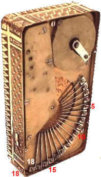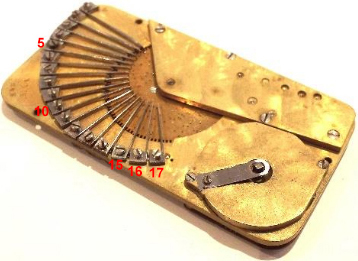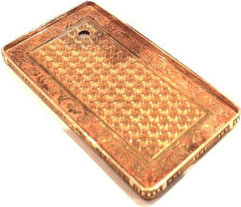 292 An extremely fine diminutively-proportioned engraved gold sur-plateau musical snuffbox, by Piguet & Meylan, case by Jean-Geo. Reymond, Swiss, circa 1805, Ser.-N° 292, the plate corner stamped P[iguet] & M[eylan], with the double-sided pinned sur-plateau of 18 inner and 17 outer single teeth in typical linier-radial formation, playing a single complex air Six-stage escapement with runaway governor, engine-polished plates with velvet-contour finish, mounted within the rectangular case, with stamped lid interior, plain highly polished surfaces throughout and completely hidden hinge loop run, the lid and underside with decreasing circle ground, grape and flower trails with stylised diamond corners, repeated to all sides, the lid reserve with stepped mitre frieze, twin rectangular corner bosses and larger diamond rounded corners, start/stop slide to front-left, open winding arbour access to underside, with a period gold fob key of open heart-from trace – gold case weight 63 grams, total weight 114 grams, 2.5/8 inches (6.7cm) wide, 1.7/16 inches (3.6cm) deep, the height .11/16 inches (2cm), the sur-plateau diameter 1in. (2.5cm) (© Laurence Fisher)