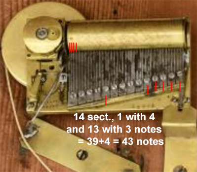 Ungemarktes Sektionalkammpielwerk mit 14 Sektionen, 1 mit 4 und 13 mit 3, insgesamt 4 + 39 = 43 Zungen, in einer Bilderuhr ©FontaineĀ“s 2025