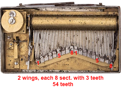 2 wings with 18 sections with 3 teeth each, all together 54 teeths, N° 1093, in a guttapercha case, with a sticker of the retailer Page Keen & Page Ltd ©Private ownership