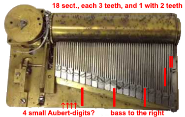 Spielwerk, 18 Sektionen à 3 und eine à 2 Zungen