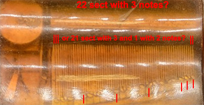 Sectional comb movement with 21 sections, 20 with ~3 notes and 1 with 2 notes (?), 20x~3=60 + 1x~2=~62 teeth, in a tabatiére Chambre des Deputes Stride & Son 2025