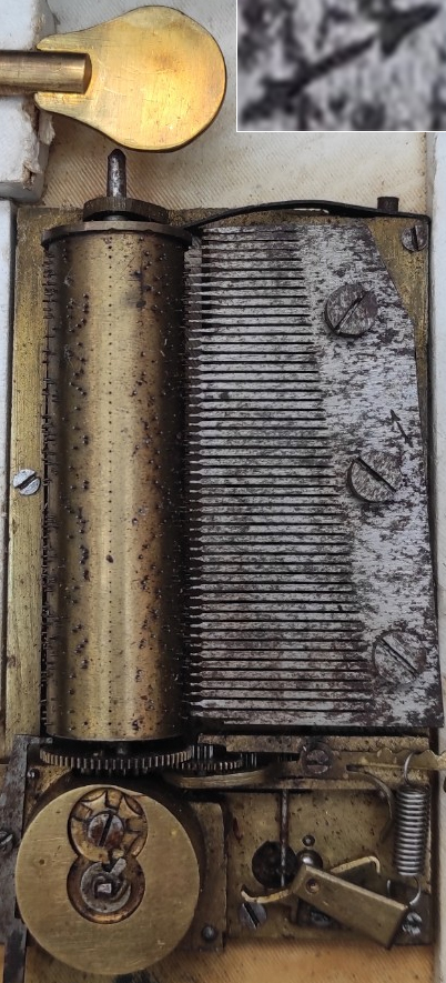 Kryptisches Zeichen am Kamm einer mit „MF“ (ligiert, Mermod Frères) auf der Grundplatte der kleinformatigen Spieldose