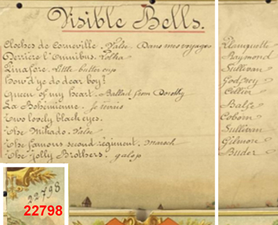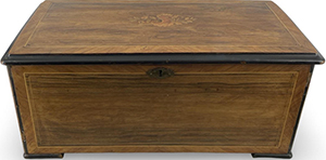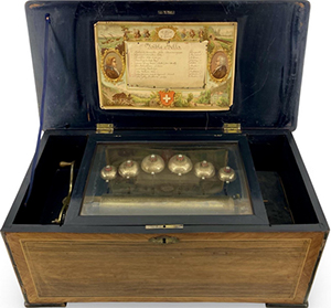 2/2: •Mo – Rossini•: No. 22798, No. 7080 (on governor-cock), probably by Arthur Junod, playing twelve airs, with 61 musical and percussion teeth (complete, one neat tooth repair), drum, five bells and castanet, in grained case with facsimile tune-sheet, inlaid lid and pair of figural plaster (?) candle-holders modelled as a jester and a Mephistophelean character, the latter with indistinct incised mark "LS", wd. 25 ¼ in. (64 cm), cylinder 13 in. (33 cm), playing condition, spring somewhat loose in arbor - will require attention. The candle-holders are an unusual addition, apparently of the period, but probably not original to the musical box. Neuaufnahme vom 5. Oktober 2025