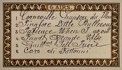 Ornate bordure Balls With A Point On a Tent 6 Airs, 1st: Corneville Chanson 6 Airs, 1st: Corneville Chanson Fig. 30-28. Post 1880. The latest tune is from Gilbert and Sullivan comic opera Pirates of Penzance, which premiered in 1880. (Bellamy: Tuneheets Makers Agents (2022), p. 30/8-9, Fig. 30/28)