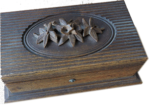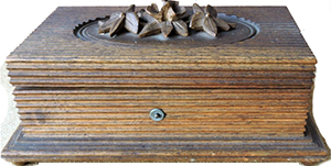 Spieldose von Heller Bern um 1900 im Holzgehäuse mit gerillten Seitenteilen und profilierter Abschluss, kleine Noppenfüße. Deckel ebenfalls gerillt, mittig mit geschnitztem Bouquet. Im vorderen Bereich der An- und Ausschalter. Linke Seite mit Hebel für Melodienwechsel. Deckel leicht verzogen. Mit Schlüssel zum Aufziehen.